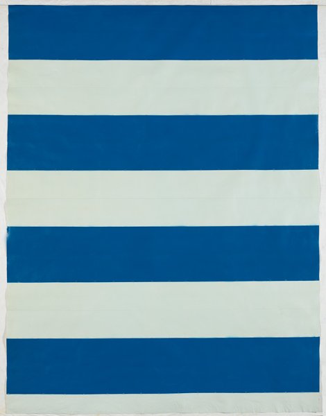 Paint on free canvas, 7 painted horizontal strips, alternating blue and white, each 38 cm wide (4 + 3) and, at the bottom, 1 13 cm partial white strip
