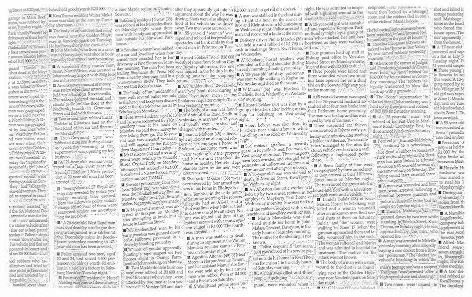 Kendell Geers' installation 48 Hours was made in London in 1999. The artist covered the Stephen Friedman Gallery’s windows with articles about bloody crimes from South African newspapers. The accumulation of photographs and descriptions of killings exposes the violence in post-apartheid society South Africa since the late 1990s.