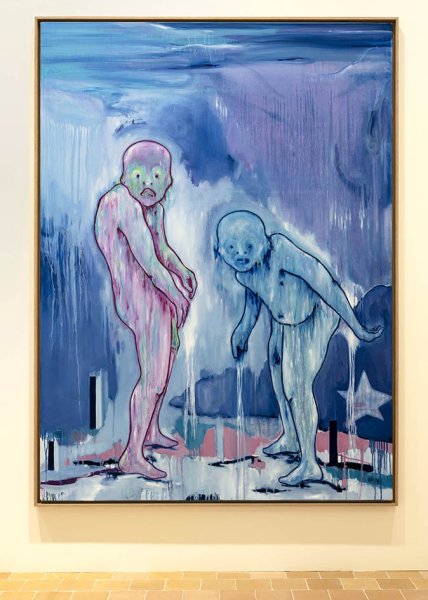 The figures in Gicquel's painting Ablution look as if they have been caught by surprise: their mouths are agape and their eyes wide open in astonishment. Taken aback, the two silhouettes differ from each other in their poses and the colours that both fill them up and slip off them like a driving rain. The work questions human beings’ ability to bear life’s worst hardships, but also their ability to overcome and confront them.