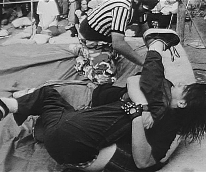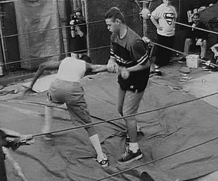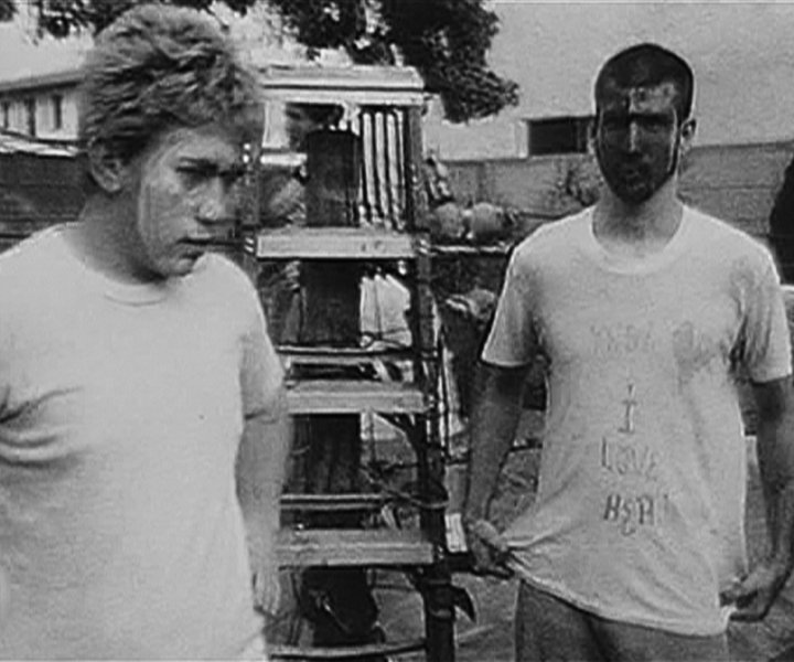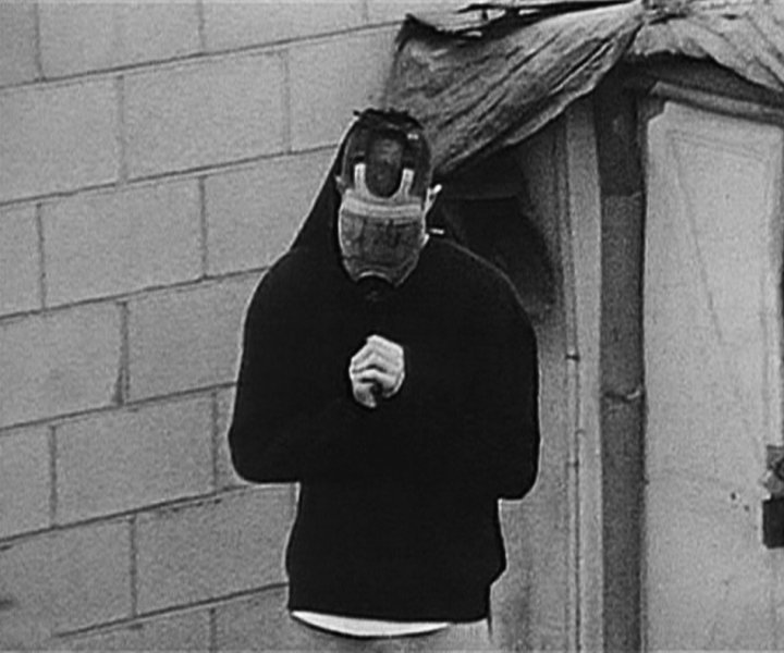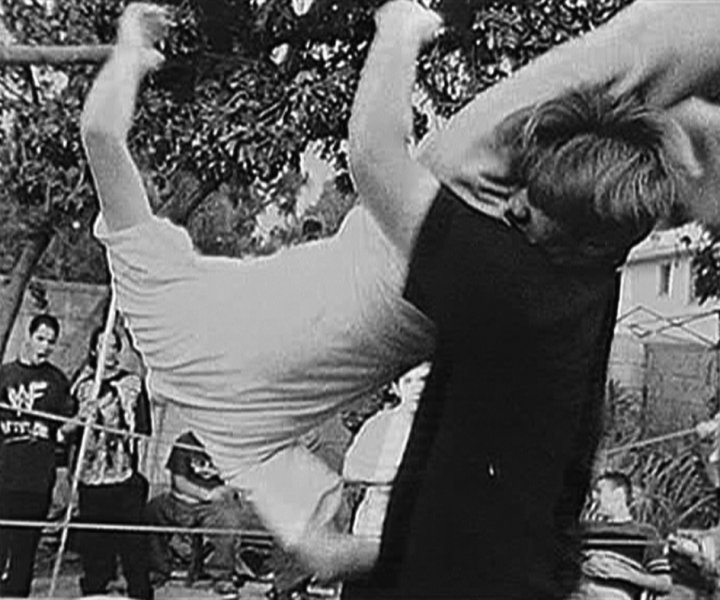 Shot with two Super-8 cameras, BB shows a wrestling match organised by youths in the backyard of a suburban Californian house. The black and white images, slow motion effects and music by the famous heavy metal band The Melvins, which accompanies the video, thrust us into a kind of tortured, miraculous nightmare.
