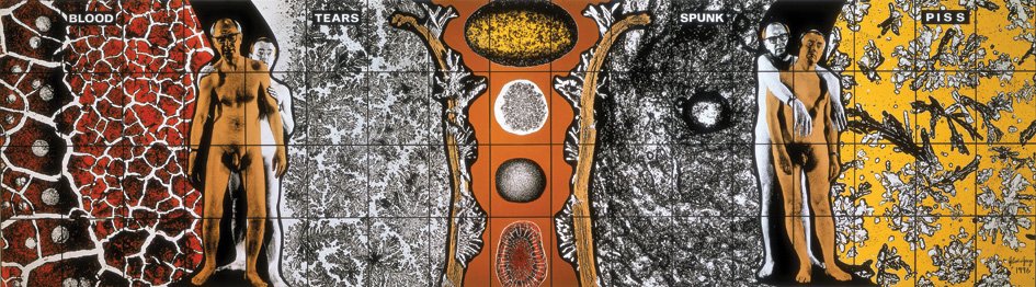 A couple of naked men, depicted twice, stand out against a decorative, organic background in four parts: Blood, Tears, Spunk and Piss. Here the English artist duo stage themselves in an aesthetic depiction of bodily fluids. The work explicitly refers to homosexuality and raises awareness of the risks associated with homosexual relations such as AIDS.