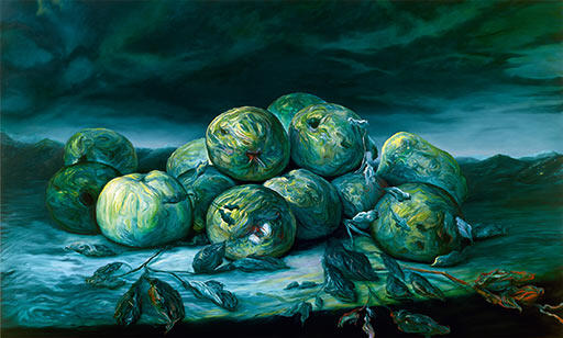 There is nothing appealing about this fascinating still life. The putrid, tart green and blue-toned apples in Burlesque float in an unreal, almost dystopian atmosphere. The organic texture of the fruits and their setting gives the work a dreamlike or mystical dimension and plays with the conventions of still life.