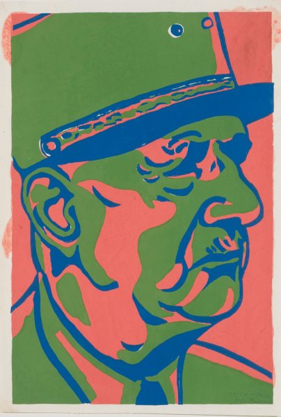 This three-quarter portrait of Charles de Gaulle wearing a kepi, signifying his role as a general during the war, is in bright shades of pink, blue and green.