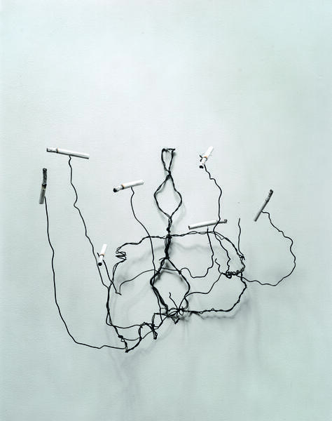 Cigarettes burn at the end of interwoven wires. This seemingly simple work by David Hammons is in fact filled with meaning and poetry: an eccentric piece of furniture, it could also be considered an allegorical representation of a certain type of person.