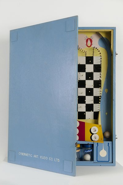A blue-painted box opens out onto a game board resembling a kind of pinball machine. Tetsumi Kudo’s DIY sculpture Cybernetic Art blazes a colourful, erotic trail. A phallus-shaped throttle, a vulva frieze, drops of sperm and bodybuilders’ silhouettes decorate this cybernetic game merging body and machine.
