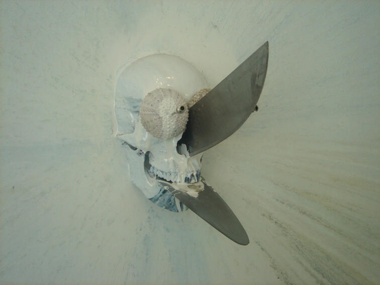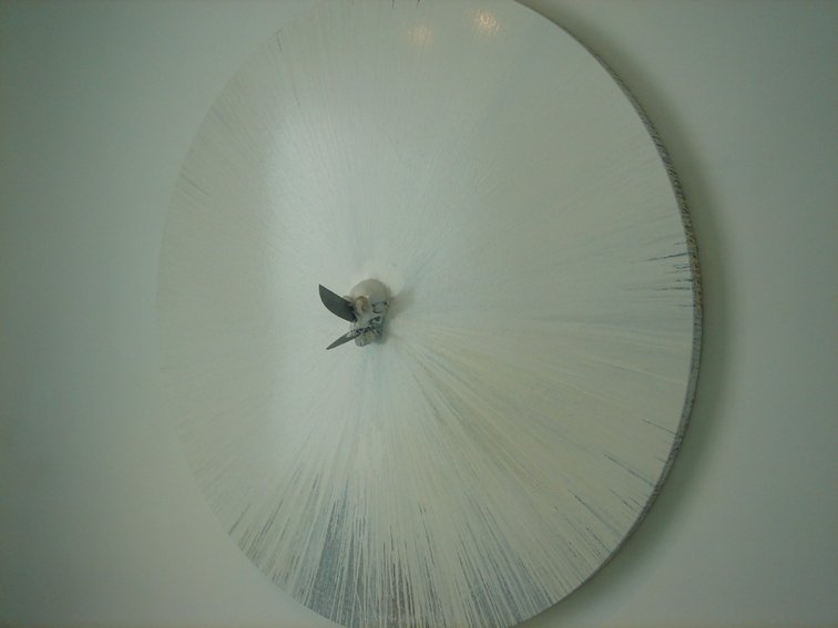 Household gloss on canvas with human skull, knives, coin and sea shells