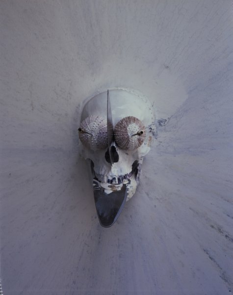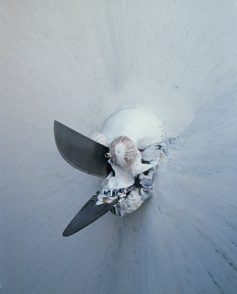 The Death of God, a work by Damien Hirst in the Pinault Collection, depicts a human skull whose eyes are formed by shells in the middle of a round white plate. The nose and mouth are pierced by knives. This enigmatic, surrealist sculpture prompts us to reflect upon death and religion, two themes at the heart of the artist's work.