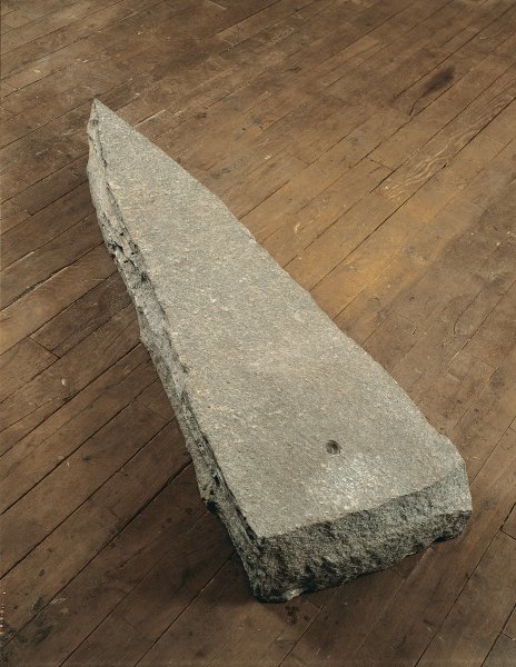 A triangular granite wedge is placed on the ground. It points out to a direction that could either be chosen or random, real or symbolic, and appears as a crude and mysterious signal. When getting closer, one notices that a compass is imbedded in it. Through its presence, the stone becomes a witness of the action of the earth's magnetic field. With this surprising juxtaposition between a stone block and a navigation instrument, the Direzione sculpture invites the viewer to reflect on sense and direction.
