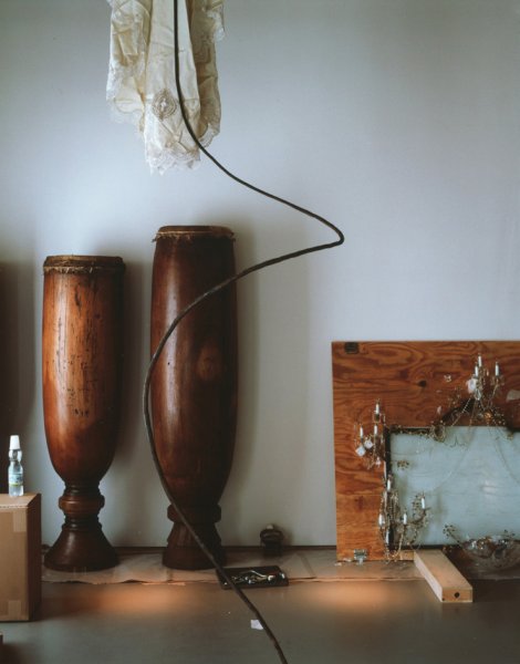 A board and a lamp stand against a white wall alongside two wooden drums. Other scattered items litter the floor while a black cable, twisted and suspended in a cloth, runs vertically across the image. This set of objects, which seems to be an installation conceived as such, is nothing more than a puzzle of several works being installed.