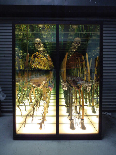 In a glass cage, two mutant figures made from the artist Matthew Day-Jackson’s skeleton seem to untidily shift from a natural to a rational state. The play of reflections caused by the display windows tends to endlessly multiply in a long line, like the proof of a fictitious evolution of humanity.