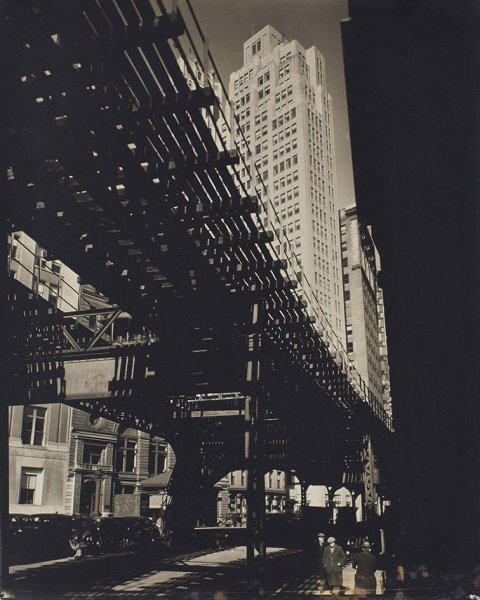 The slanting shape of an imposing metal subway viaduct covers almost the entire frame of El, 2nd and 3rd Avenue Lines: Hanover Square and Pearl Street, Manhattan, 1936. Its dark openwork silhouette gives the work a highly contrasted chiaroscuro effect.