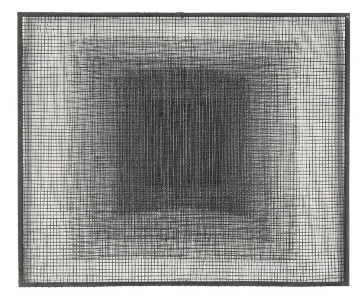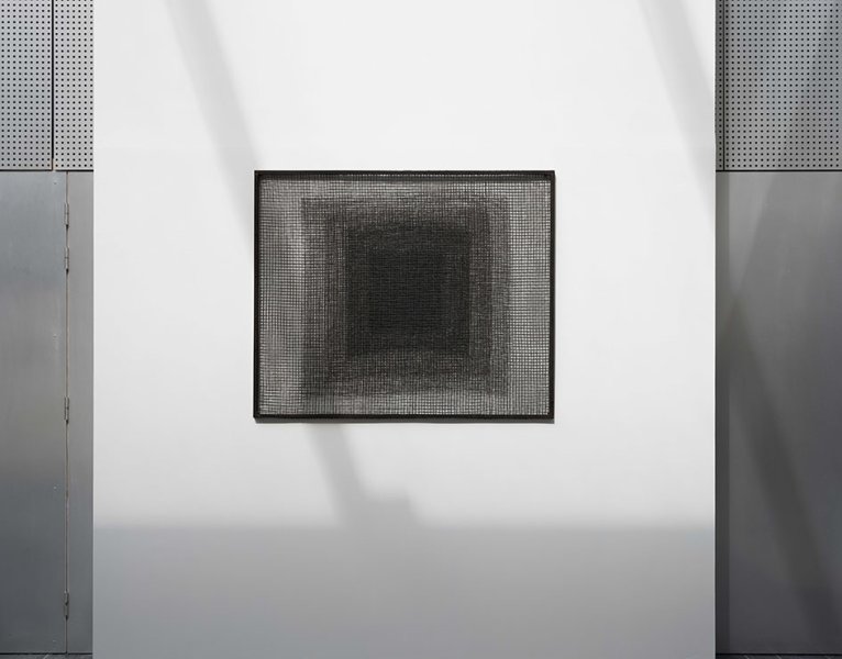 The filters, which result from the juxtaposition of several half-transparent surfaces, fuse with the surrounding environment. The canvas is replaced by several layers of metal wire mesh. Two of these nets are fixed on a rectangular frame. In between, other nets, these ones square, are superimposed. Their format is gradually reduced down to the smallest, central square, which has a tighter and denser pattern that makes it look darker. According to the artist, this work is halfway “between the theoretical space and the real space”. It is about “a situation of chromo-energetic absorption” created by adding surfaces that have a low light absorption coefficient, which “determines a dynamic of chromatic intensity that is inversely proportional to the additional action of the filters”.