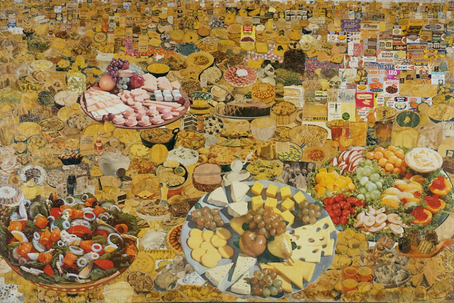 Foodscape leaves no space empty. A mixed salad, fruit salad, cheese board and plate of petits fours fill the painting with overloaded opulence, dominated by the yellowish hue typical of old cooking magazines. Despite its eclectic nature, Erró's food collage is thematically arranged in perspective, with the items at the top appearing to be further away. An example is the corner of the biscuit tin.