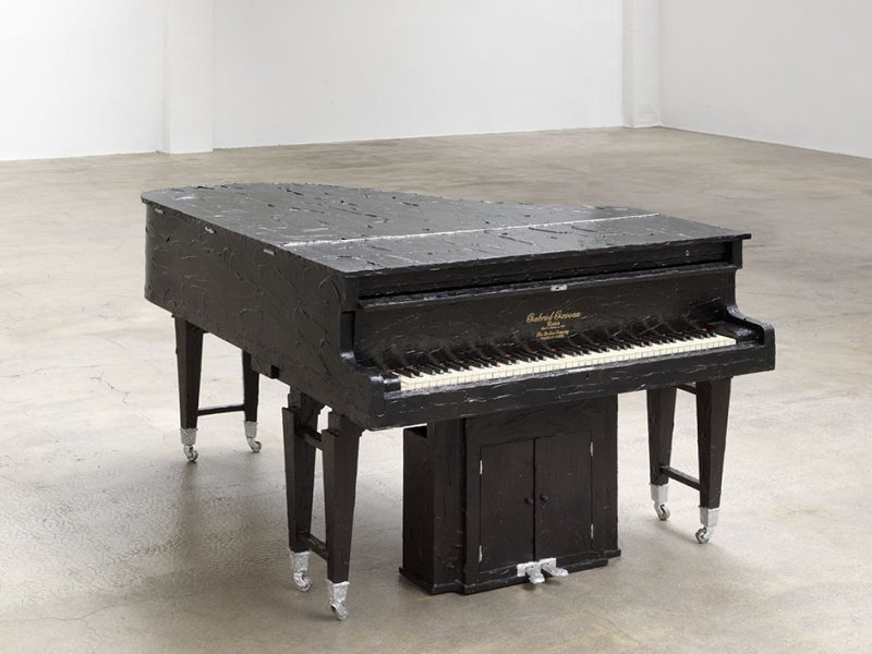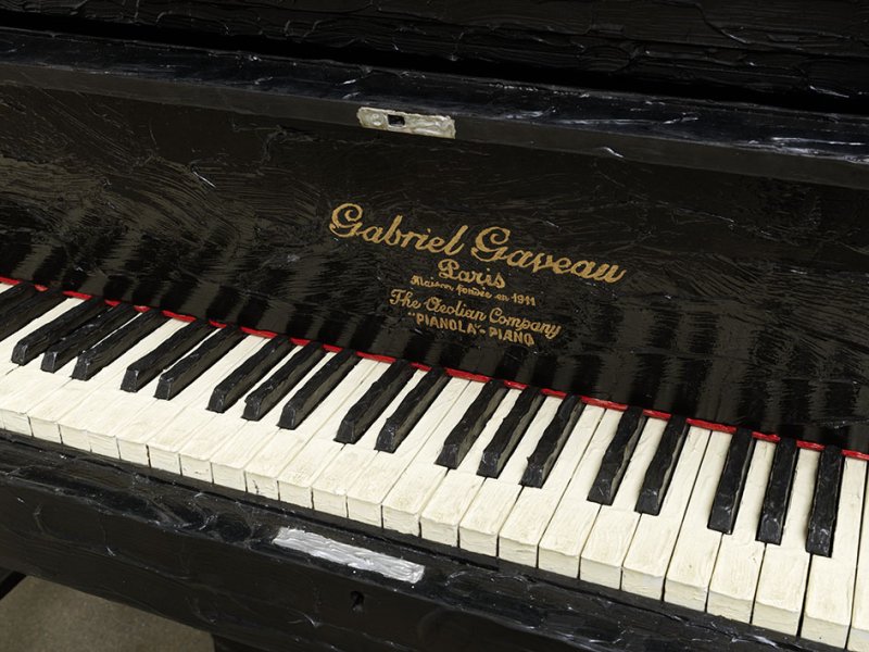 A black Gaveau grand piano is entirely covered with a coat of black paint except for the white keys, the gold pedals and the piano maker’s name. Intact despite being covered in paint, the instrument is ready for use.