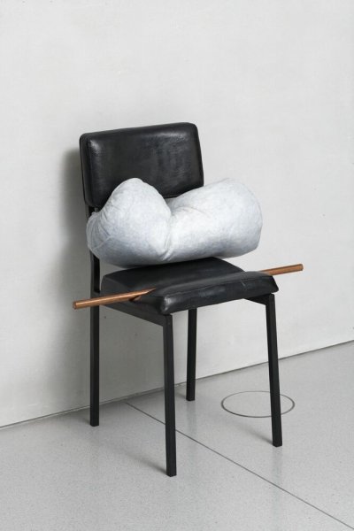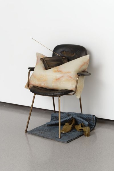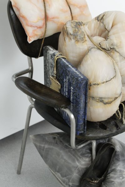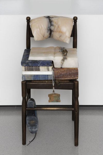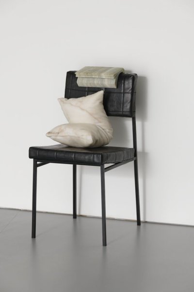 In the Guardian series’ sculptures, the exhibition guard is conspicuous by his absence. He is alluded to here by the item specific to his function, i.e. a seat. The absence of the main subject, the presence of unexpected objects (a cushion, a metal rod) and the disturbing materiality of marble, bronze and onyx set the work on the border between dream and reality.