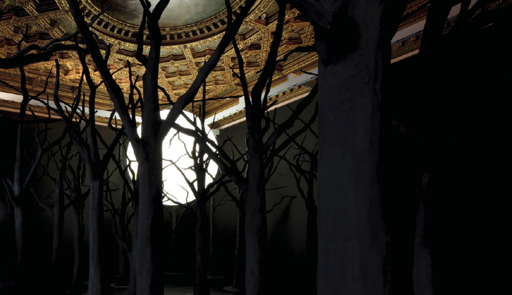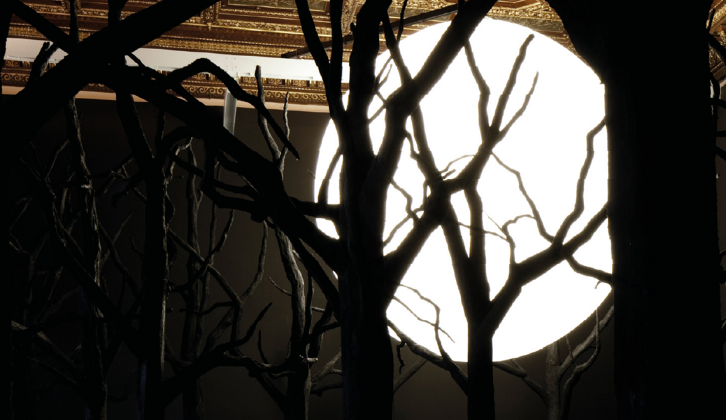 The branches of a carbonised forest are covered in gunpowder. In the centre floats a shining bubble, an imposing moon in the shadowy night. The whole scene seems to be taken straight from a film set.