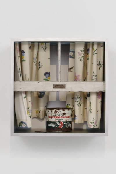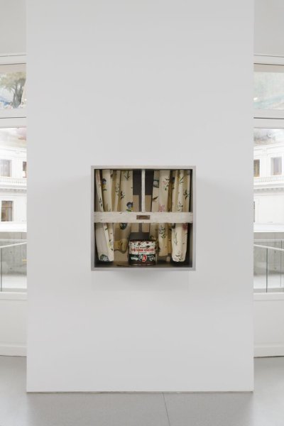 Robert Gober’s Help Me is composed by the frame of a window and a group of mundane objects: curtains, a grease can, a pencil, all of them handmade by the artist. If the inside of the window is visible, the opening only get us access to the wall behind, thus creating a suffocating feeling. The calm beauty of the wind blowing inside the window, the household aspect of the assemblage, which creates the impression of standing in front of a common American house or farm as the grease can suggests, paradoxically reinforces the enigmatic, if not harrowing, feeling about the scene, sentiment heightened by the title. Numbers of Gober’s works establish a tension between the inside and the outside – the artist frequently uses the visual artifice of bars – giving the sensation that some things are kept buried, under the weight of social constraints, of shame, of injunctions. Help Me, while letting outcrop existential and biographic questions, also roams about art history: the frame of the window could also be the one of a canvas, interrogating the illusionist dimension of an artistic image.