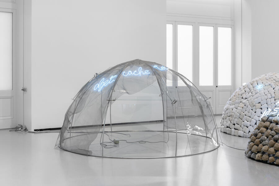 “The igloo is the ideal organic shape, both a world and a small house,” said Mario Merz about the potential of the igloo form, which he introduces in his work in 1968. Igloo Objet Cache-toi is part of this iconic series: made with composite materials, it plays on the transparency of the nets and the brightness of the neon lights that spell out the title.