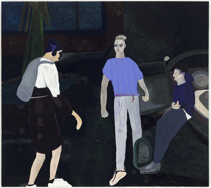 This painting belongs to a series of three large panels, each of which represents, strictly in the foreground, interactions, more or less enigmatic scenes involving young men against a nocturnal background: fights, dances, pick-up scenes? Painted at life size, the bodies are captured by pure colour in flat tints, and suspended in tense movements and expressions, with an indecipherable choreographic tension.