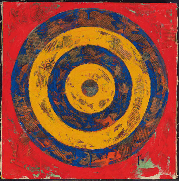 Her piece Johns Target (first study) (1986) can perhaps be associated with the Targets that Jasper Johns created between 1955 and 1961. The target and the American flag would become one of the artist’s most radical and recognisable motifs. For Johns, the target was a way to paint “things that the mind already knows”, an idea that Sturtevant took one step further. She explained that, “when you realize that it’s not a Johns, you’re either jolted and you reject it immediately, or the work haunts you like a bad buzzing sound in your head. You have to start asking yourself what's going on here... how this works”.* The disparities between the versions encourage the viewer to look past their superficial similarities and to question deeply the essential, underlying structure of art.
