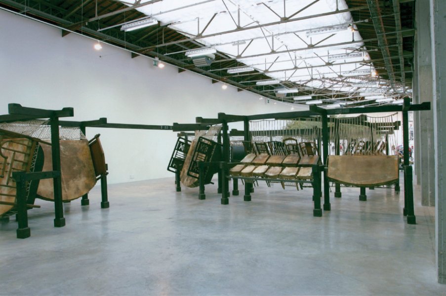 This network of drums made of cowhide skins stretched over structures of beds and chairs linked by a clever mesh of ropes and strings invites the viewer to experience the power of vibration through the sense of touch. In this installation, Chen Zhen connects a complex instrumental organism with our own body through a playful interaction between human and animal skins.