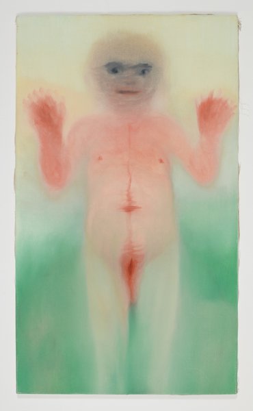 This painting depicts a baby face on, a naked child whose floating, fragile silhouette seems to be set off against a soft, spring-like horizon. Its arms are spread out and its palms seem to be resting on the blurred surface of the representation, or is it simply the reclining figure of an infant holding out its arms? The same colour, a warmer pinkish-red, draws, as if by capillary action, hands and forearms, nipples and navel, grooves of the pubic area and of the genitals, like a network of blood and heat. The lower limbs trail and fade away in the lower part of the composition, becoming lost in the cold shades of a still tender green. The strangeness, the quasi-naivety of the posture, is accentuated by a wide-eyed, frozen, bluish gaze with surprisingly pronounced brows.