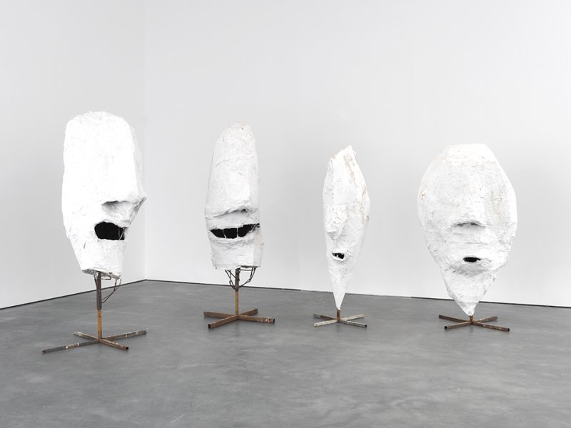 Sculptures presented on flimsy steel bases, these four Lemurenköpfe – or Lemur Heads – are enormous eyeless face protuberances, made with gauze and plaster. Their physiognomy essentially consists of three openings, i.e. the mouth and nostrils, and gives the impression of facing not four heads but just as many bellies ready to devour us.