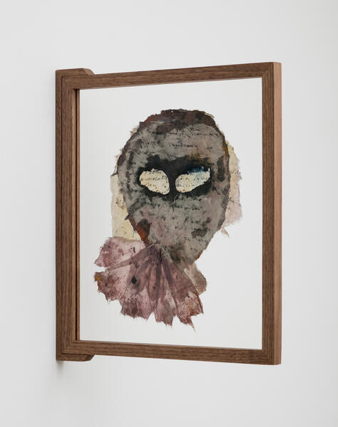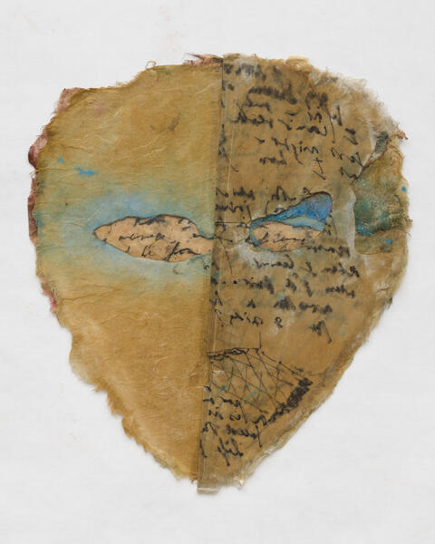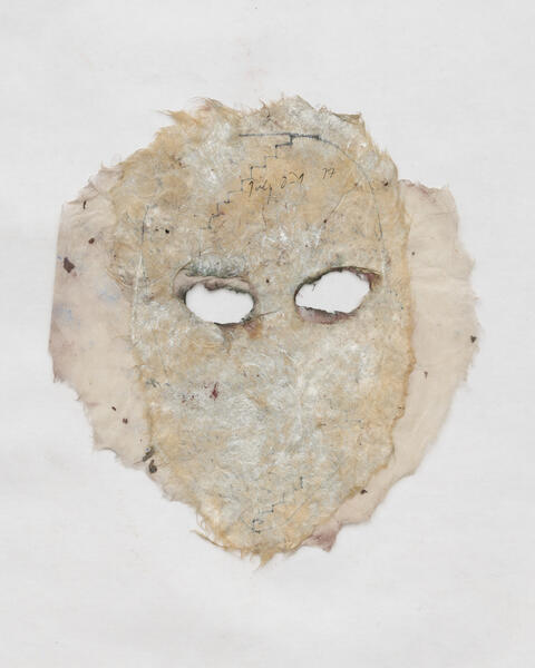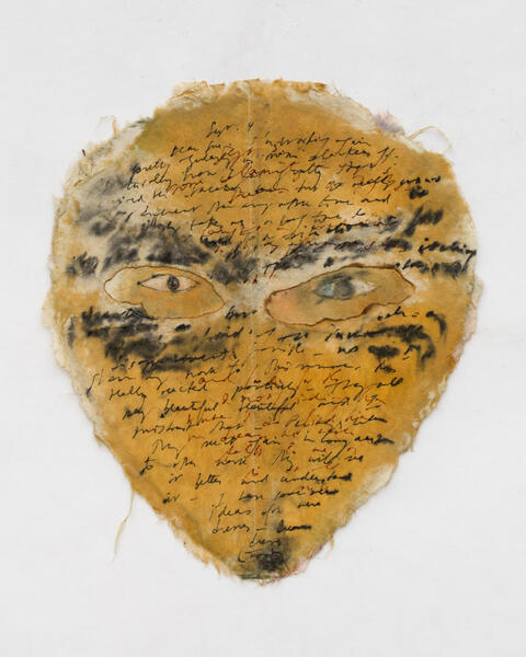 Like diaries, these twenty-one double-sided masks made of rice paper and covered with writing and architectural sketches are meant to be looked at by one person at a time, to be read in an intimate and mysterious face to face. Mira Schor explains: "The openings for eyes when they occur allow the wearer or the viewer to see out but also sometimes to see in, and in the case of the installation at the Bourse de Commerce, the ability of two friends to see each other through my layers of consciousness." At the time of their creation, Mira Schor's intention was to reveal and yet to disrupt the legibility of a woman's inner life, by using erasure, overloading, and transparency. When they are not framed, some of the masks are in fact books whose pages can be turned.