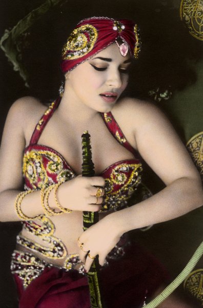 This half-length photograph portrays Egyptian-born singer Natacha Atlas in a shimmering outfit that leaves little to the imagination. Lying down, eyes closed as if asleep, she holds the tip of a hookah in her hands.