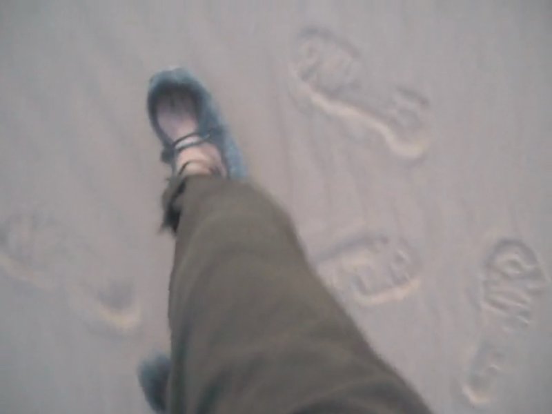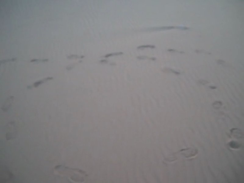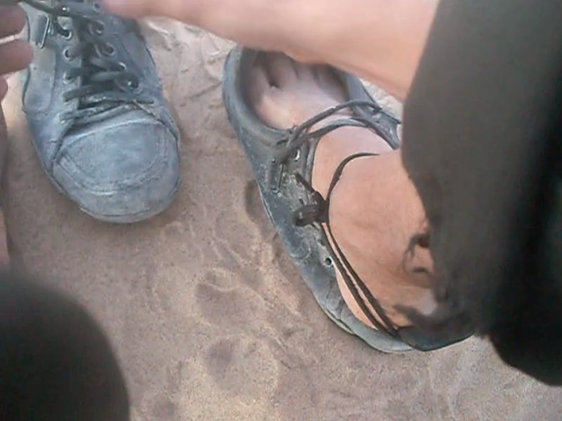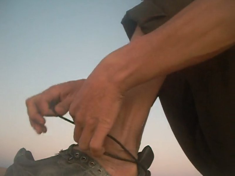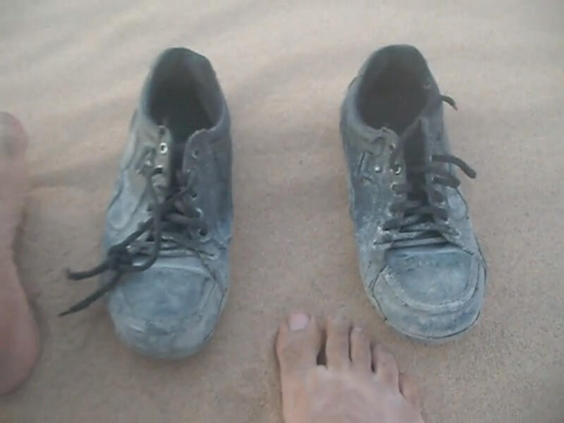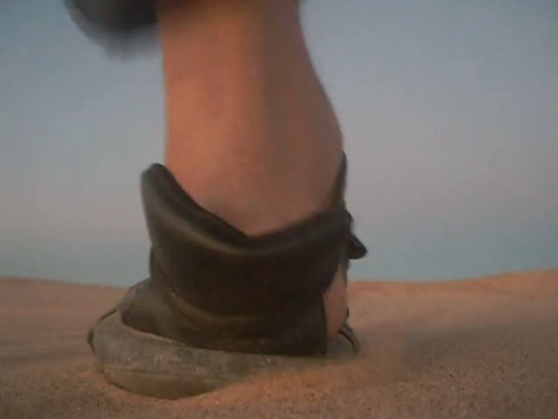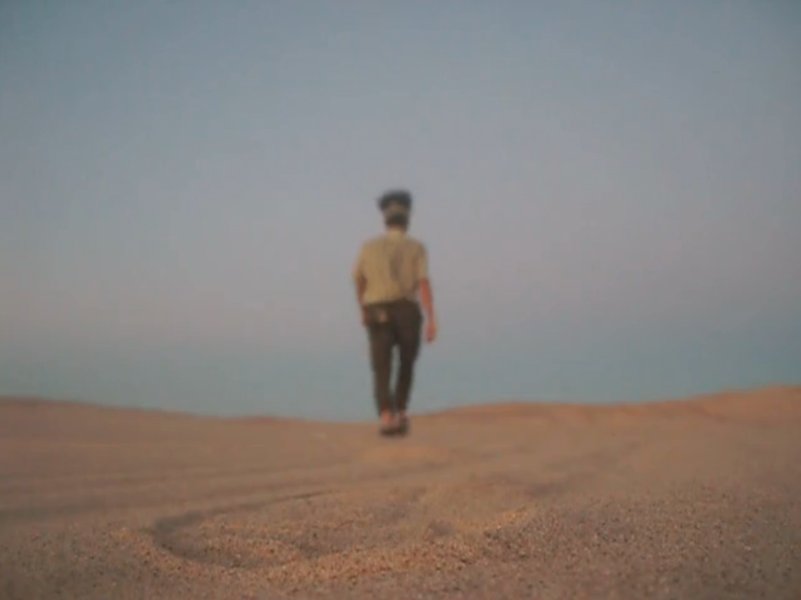 The video Para Cuando Ellos Me Busquen En El Desierto – For when they look for me in the desert shows Paulo Nazareth sat in a desert; he takes his shoe laces off, puts his shoes on backwards and starts walking. With this clever trick, his footprints go in the opposite direction of his steps and thus mislead whoever is chasing him, whether border guards or others. He tramples on the sand, puts the camera down and walks away towards the horizon.