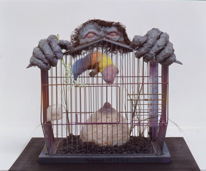 More grotesque than macabre, a face that is all but destroyed by acid—only the eyes are left—and a pair of hands are lying on top of a birdcage. Inside, instead of captive birds are held a penis and a breast. Titled Paradise by Japanese artist Tetsumi Kudo in his usual wacky, caustic critique, this artwork places on the same level the grim and the poetic, the obscene and laughter.