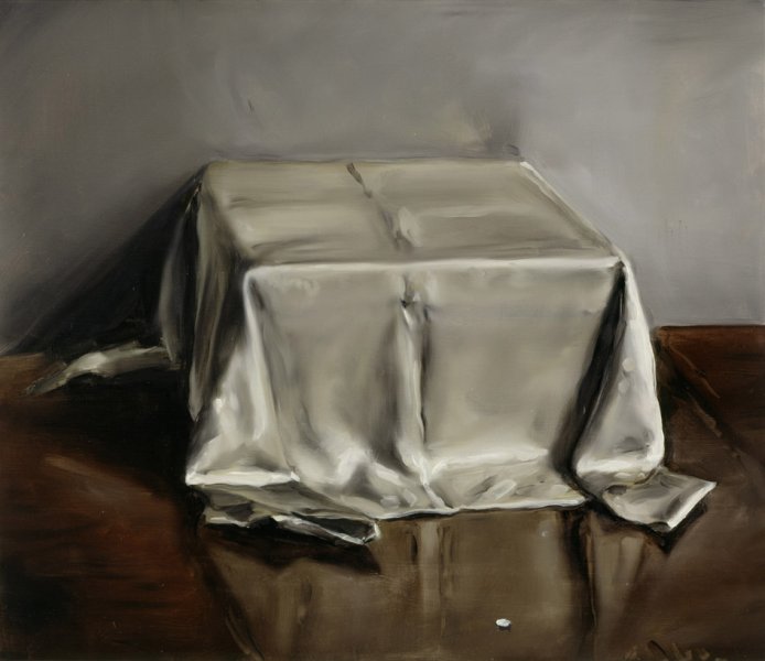 The only subject of The Performance is a satiny sheet covering a quadrangular object, probably a crate, lying on a reflective wooden surface. The only decor is a neutral grey background. Its extremely sober composition and chromatic palette and lack of context remove any descriptive dimension from the work.