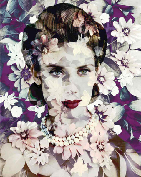 This stereotype of beauty melts into the background of greenery that surrounds her. Valérie Belin works in two stages: she creates two different images, first the portrait of an elegant woman, then a bouquet of flowers that overlays the portrait. This overlapping creates a surprising image that evokes a sophisticated form of overprinting.