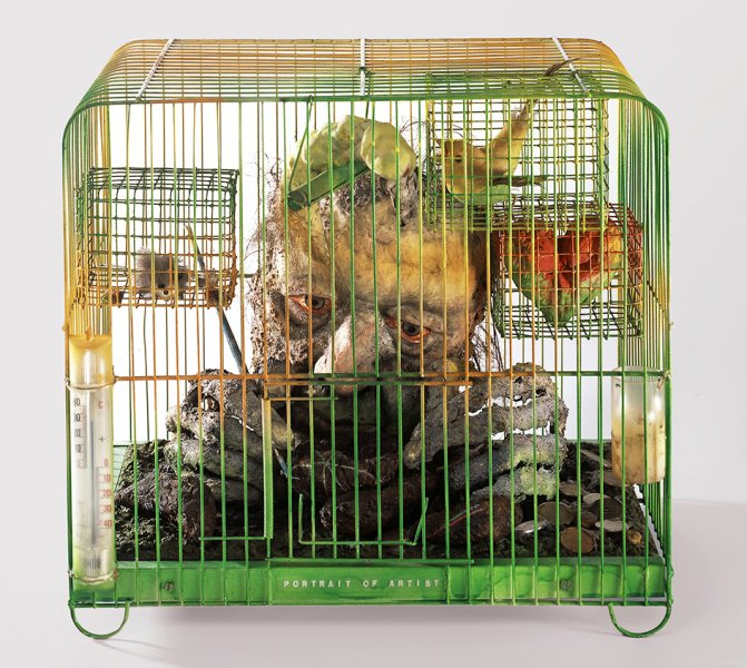 A face worn away by acid, as is the accompanying pair of hands holding a feather, is held in a birdcage. Next to it, a heart—part of the same being?—hangs in a miniature cage, attacked by mold. Titled Portrait of Artist in Crisis, Portrait of Eugène Ionesco, this artwork by Japanese artist Tetsumi Kudo conveys his trademark irony and gives equal importance to the sinister, the poetic, caustic critique and laughter.