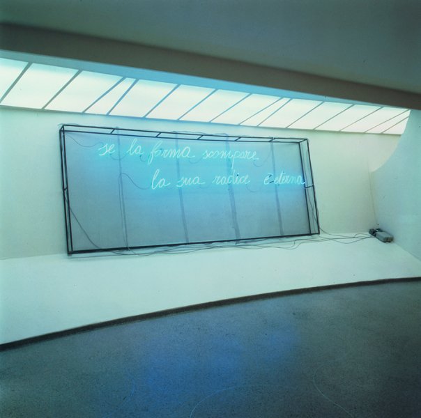 Thin neon tubes are fixed to a wire mesh screen and compose a sentence: “Se la forma scompare, la sua radice è eterna” (“if form vanishes, its root remains eternal”). The calligraphy is typical of Mario Merz: round, studious, almost childish.