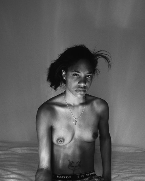 A powerful self-portrait, Self Portrait Oct 7th (9:30am) confronts the viewer with the frank and hard gaze of LaToya Ruby Frazier. Half naked, disheveled and half-lit, she gives an unvarnished picture of her morning routine. To her nakedness corresponds the minimalism of the white walls and sheets, as an impersonal backdrop to her deeply intimate narration.