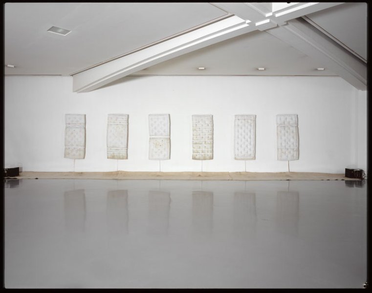 A series of six apparently heavy mattresses held up straight by thin supports are linked by what appears to be white ropes. The links appear to be refrigeration tubes that, connecting one mattress to the next, transform the fabric into an icy surface. Usually evoking comfort and warmth, the mattress, now vertical and cold, becomes uninviting.