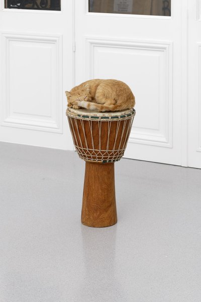 Curled up in a ball, a ginger cat sleeps peacefully—in reality, it is stuffed—on a djembe, an African percussion instrument composed of a wooden barrel in the shape of a chalice and a skin stretched by a bundle of cords. The result is a striking, ambiguous image that is both familiar and radical. Created in 1996, Standing Room Only is a perfect example of the way David Hammons constantly explores the association of objects, their connotations, the play of words, their polysemy—often linked to African-American history and culture. Here, it is the figure of the cat, the alley cat, the musician from the street with whom jazzmen identify, and the protective presence of this instrument-root which dives into the African origins of jazz, the struggles and the voices that it embodies.