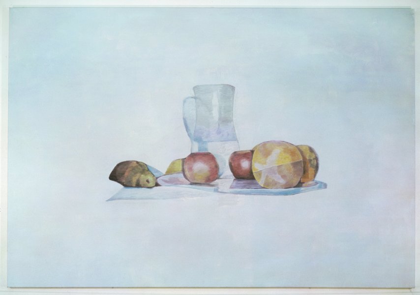 Although Still Life is based on a Cézanne watercolour, its only quotation of the artist is the humble figurative motif, a fruit still life with a carafe of water in the background, blown up to a monumental size of several metres in keeping with the genre of large oil paintings.
