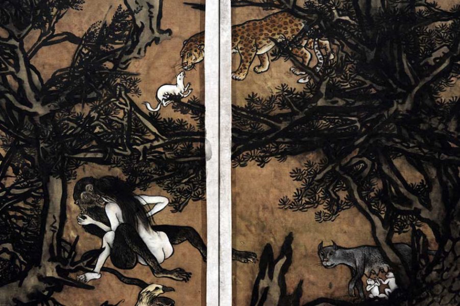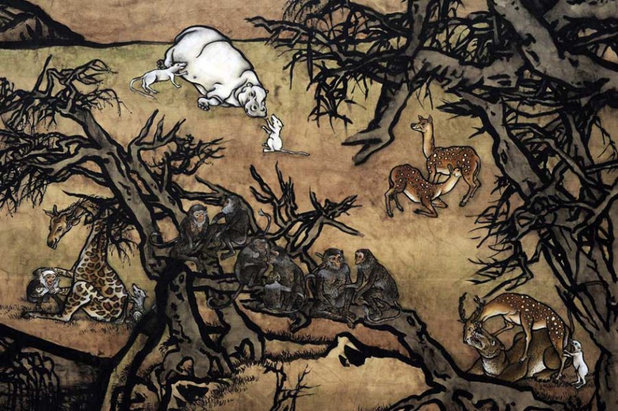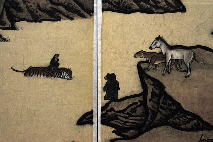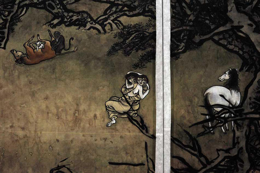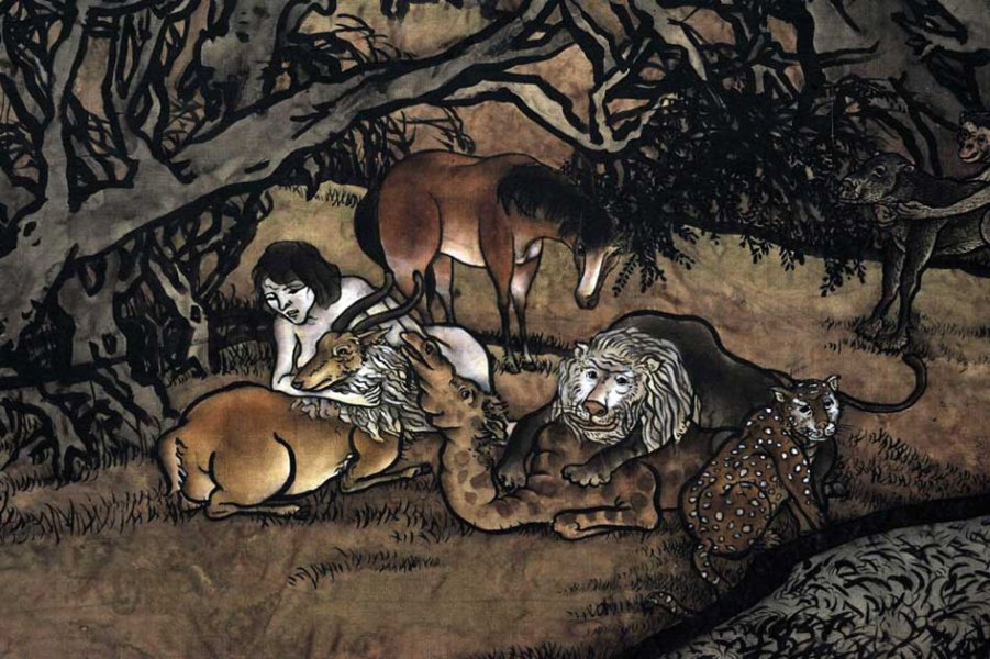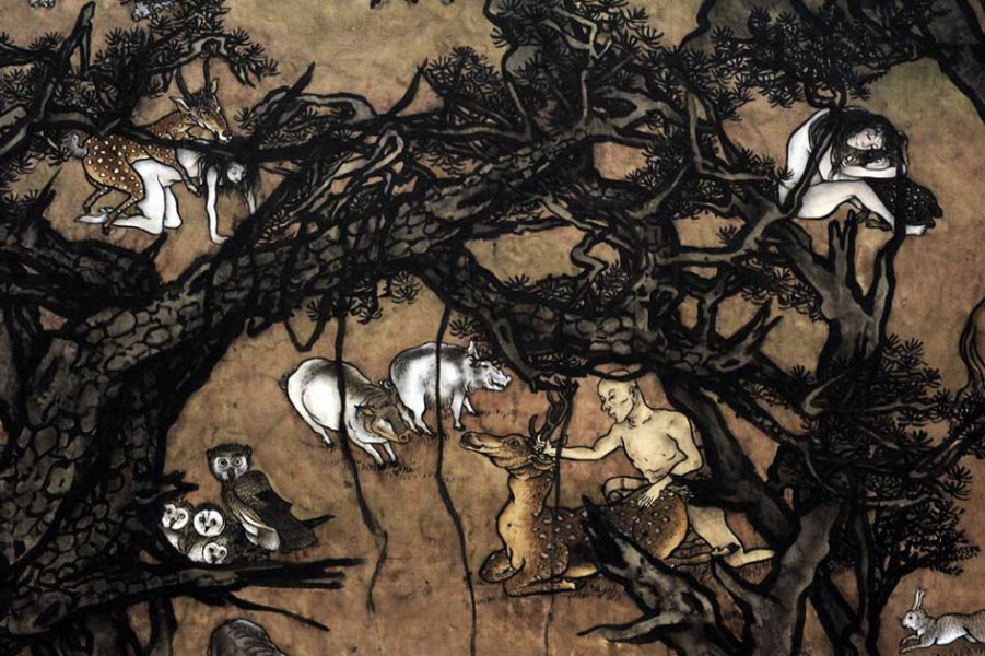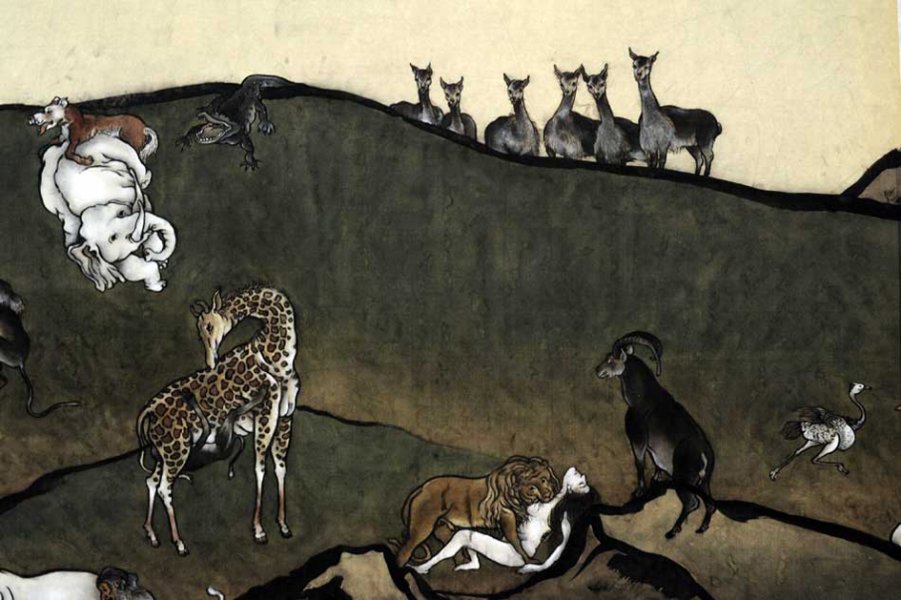In the seven panels that make up Stranger than Paradise, Yang Jiechang proposes a humorous vision of heaven where people and animals frolic joyfully in nature.