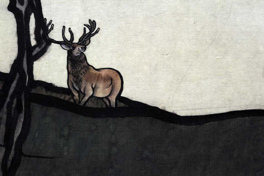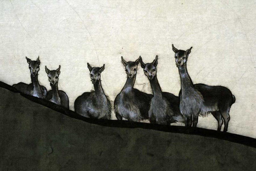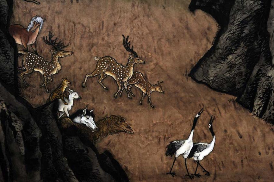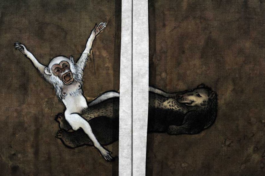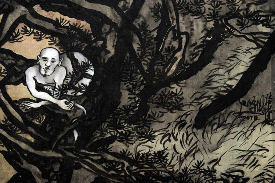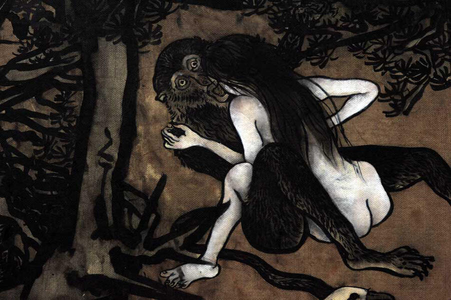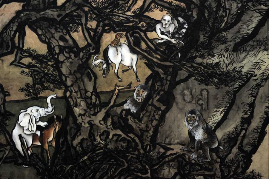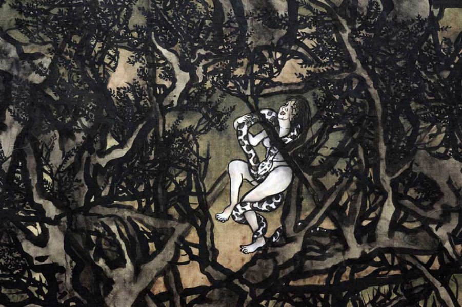 In the seven panels that make up Stranger than Paradise, Yang Jiechang proposes a humorous vision of heaven where people and animals frolic joyfully in nature.