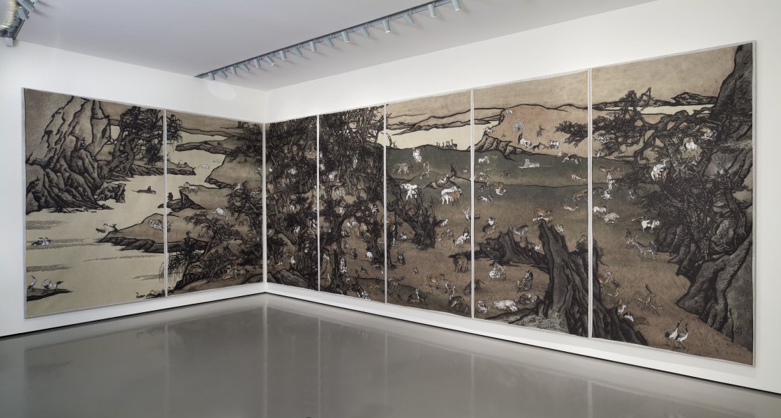 Based on the idea that, in a media-dominated world where life has become unreal and imaginary, authenticity has become a rare commodity, Yang Jiechang imagines “a landscape for a return to Nature”, which he locates in Paradise. The artist seeks to eliminate any kind of difference - religious, ideological, ethical and political - which he considers sources of conflict in modern society. Recalling the aesthetic of Chinese folding screens, the work creates a certain distance from the viewer, who finds themselves limited to observing from the outside, like a stranger, this celestial land they will never be able to enter.
