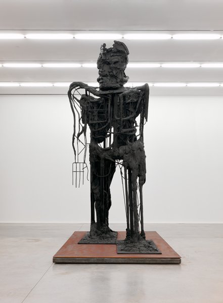 The bronze figure’s monumental body seems to be in an advanced state of decomposition, but a powerful stride endows it with amazing strength. Many of Houseago's sculptures share this theme.
