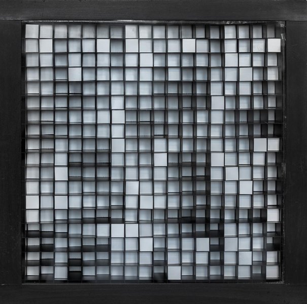 A tight metal grid encloses a host of cubic aluminium volumes. They more or less sink into the space while a play of light and shadow gives the whole work a vibrating or even kinetic rhythm.