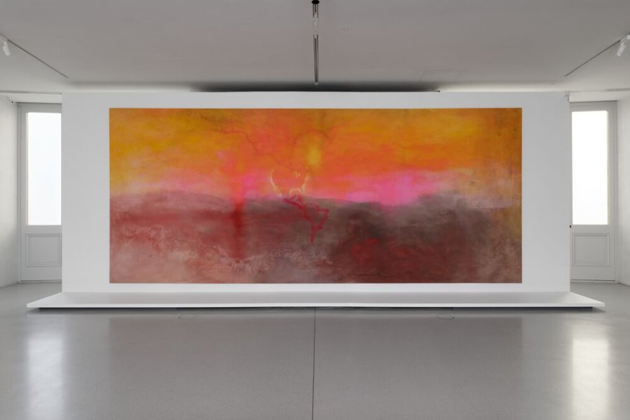 the post-colonial and geopolitical consciousness of these southern territories. Emanating an incandescent pink-red halo, the painting radiates an intense warmth that is vibrant, sublime, and unsettling all at once. A silhouette of the North and South American continents, painted with a spray can and stencils, emerges against the background of the canvas, which instead recalls the lyrical abstraction and colour field painting very much in