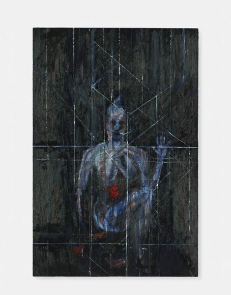 A phosphorescent life-size character sits cross-legged on an oil-coloured background. The left hand calls out, pushes or swears. The blue and green bust has a red hole in it - a bloody wound that empties out onto his leg and the ground. This painting immortalises the enigmatic suffering of an individual in the process of disappearing.