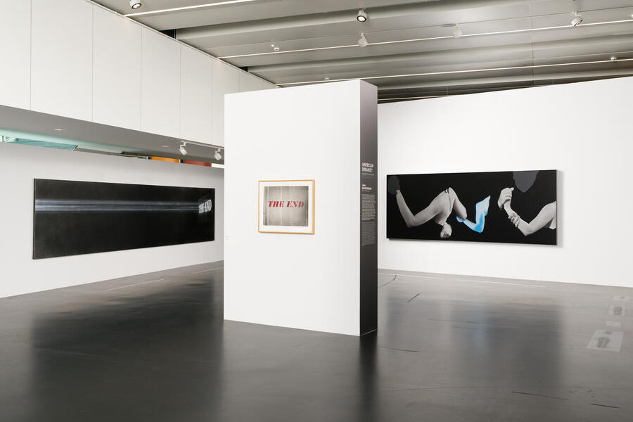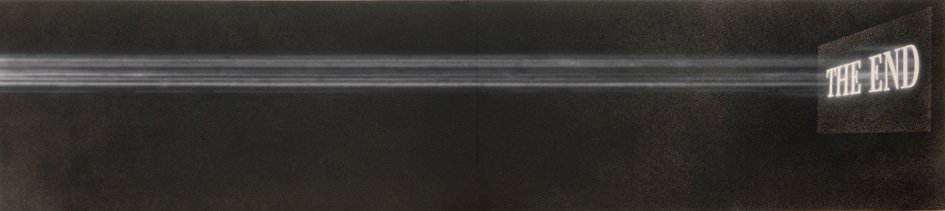 Composed of two 3.5-meter-long canvas, Ed Ruscha’s work Untitled evokes a cinema screen that is split lengthwise by a ray of light, culminating in the canonical inscription "The End".