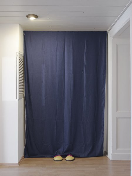 Behind a large blue curtain hides a clown, whose exuberant shoes stick out slightly. His presence behind the curtain is discernible from the sound of a heartbeat filling the exhibition space.