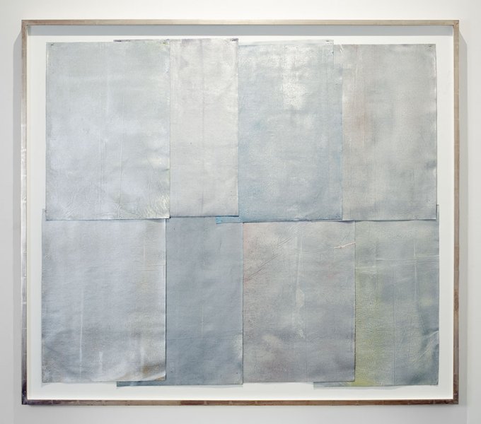 Two overlapping rows of similarly-sized linen strips, stapled together on a rigid support, break the seemingly monotonous unity of the paint covering them. In natural light, the canvas’s silvery surface seems to change unexpectedly, endlessly transforming shadows and textures.