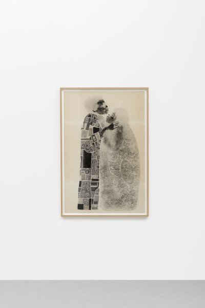 Two embracing bodies, two black figures—a rereading of the famous Kiss, an icon of the Viennese Secession, an emblematic painting of 1907–8 by the painter Gustav Klimt—have left their translucent imprint on the paper, made up of pigments and charcoal. These figures are like “apparitions,” they resemble X-ray images or photographic negatives, punctuated with precise and ornamental details: skin, hair, clothes, decorative motifs.